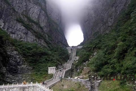 天門山(古稱云夢山),又名玉屏山,坐落于張家界市區(qū)以南10公里。公元263年,因山壁崩塌而使山體上部洞開一門,南北相通,吳帝孫休以為吉祥,便賜名天門山。天門主峰海拔1518.6米,屬典型的喀斯特地貌。天門洞則高131.5米,寬57米,深60米,南北對開,終年云蒸霞蔚,歷有天門吐霧、天門靈光、梅花飄雨等三大奇景。如今的天門山,已建設(shè)為 森林公園,為 AAAAA旅游景區(qū),景區(qū)以觀光游覽為主線,深掘文化內(nèi)涵,完整的體現(xiàn)了其“神奇”“神秘”“神圣”的大氛圍和主格調(diào),分為天門洞開、天界佛國、丹灶飛煙等十大景觀和天門山索道、通天大道、天門洞、上天梯、云夢仙頂?shù)?0余處人文與自然景點。的天門山索道,斜長7455米,上、下站水平高差1279米,成為世界上 長的單線循環(huán)脫掛抱索器車廂式索道。